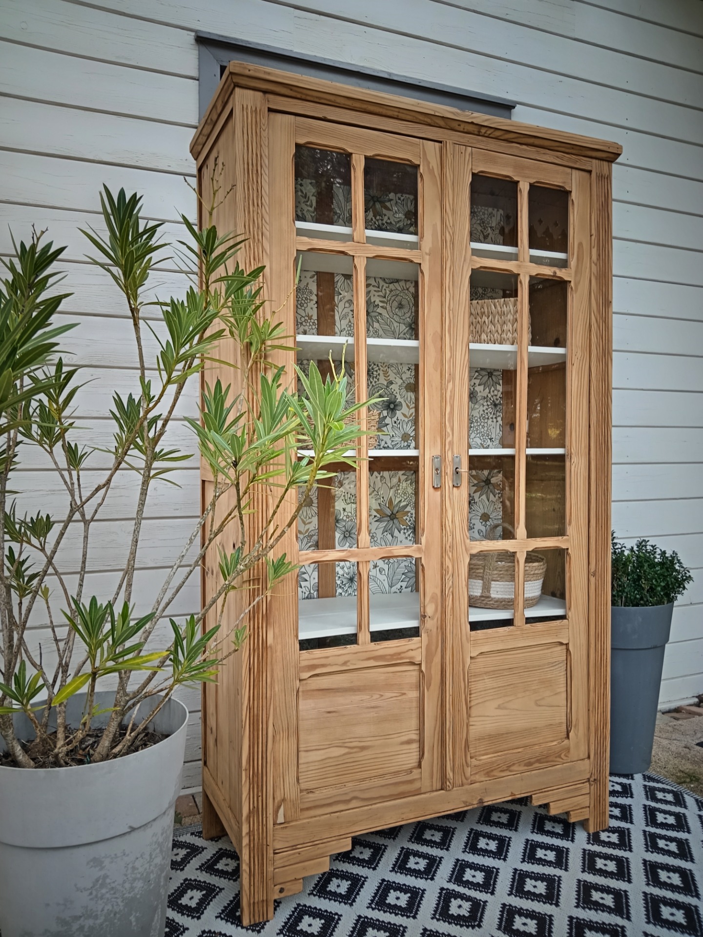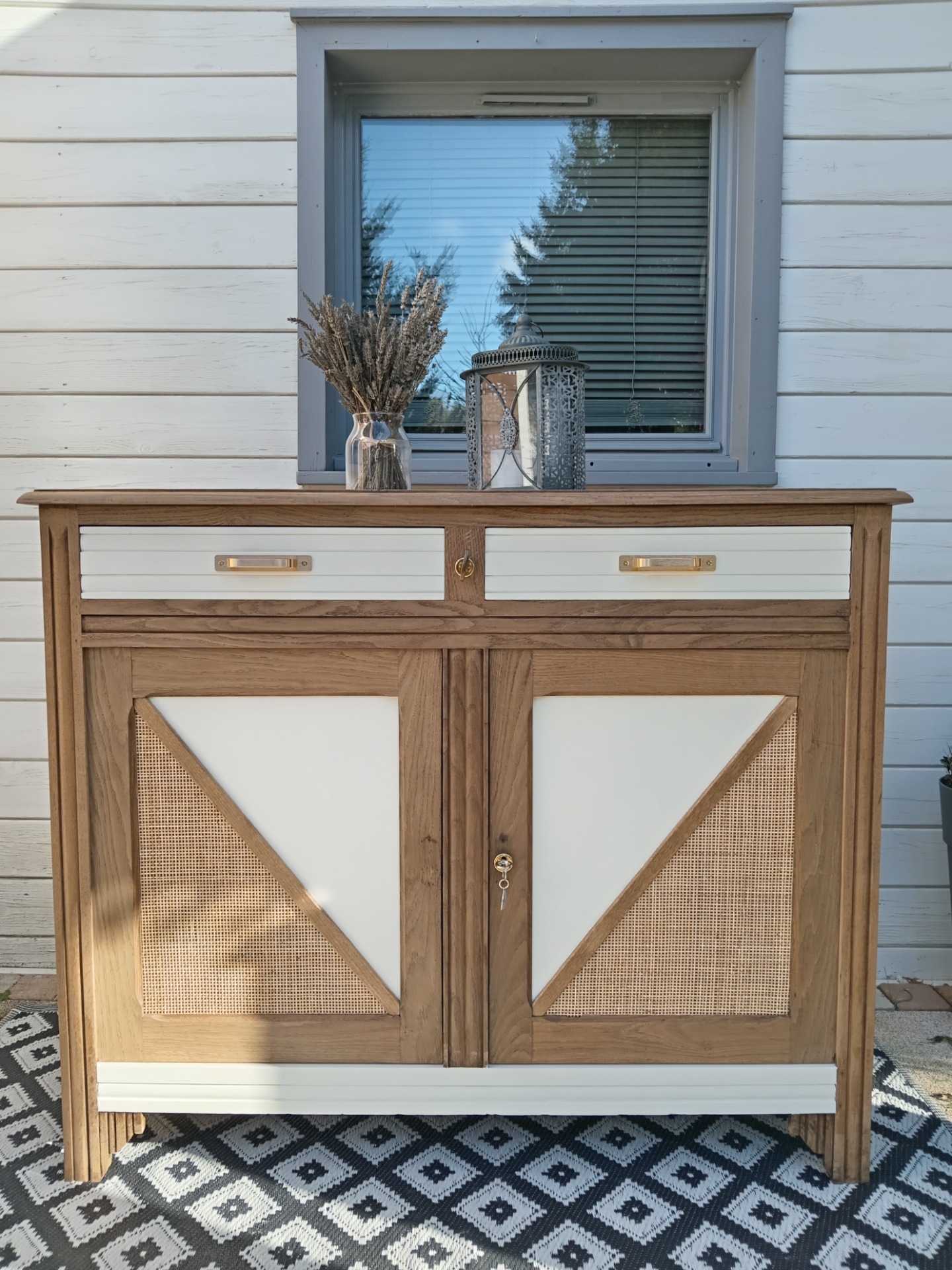 - Les 2 vitres du bas sont habillées de rotin avec un encadré bleu nuit pour rappeler l’intérieur du meuble
